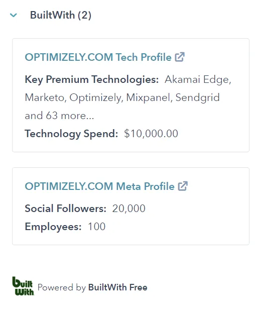 HubSpot BuiltWith FreeThis utility shows basic information about website related to contacts and companies within HubSpot -INSTALL HUBSPOT CRM FREE HEREThese details appear in the CRM Card for Contacts and Companies in HubSpot -For deeper connection into HubSpot checkout our full integration - https://blog.builtwith.com/2016/05/11/builtwith-hubspot-integration/